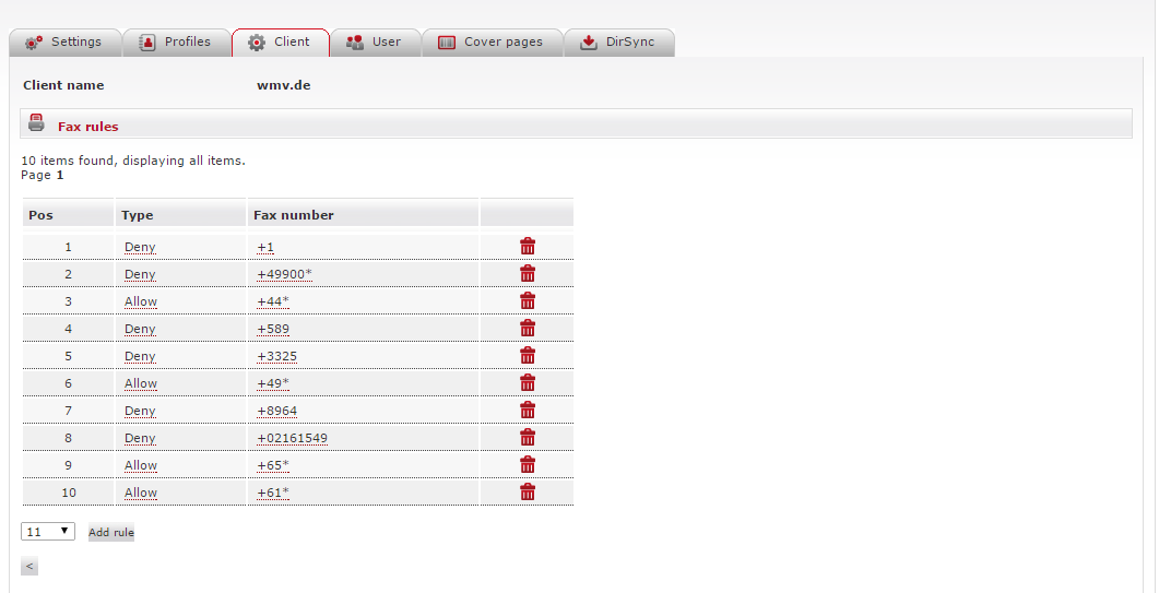 The rules are processed from the top (position 1) to the bottom of the list; however, the last (bottom-most) rule always has the highest priority. If the last rule uses the wildcard symbol (*) to block fax numbers, it overrides all previous rules, making them invalid.