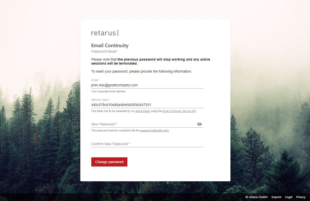 If a user has forgotten his password, he has to inform a customer admin who is able to request a security token for the user via the Email Continuity API. The admin hands over the token URL to the user (or uses the built-in email notification) who may now set a new password using the Retarus Email Continuity account management website – or the admin himself is doing this and informing the end user about his new password.