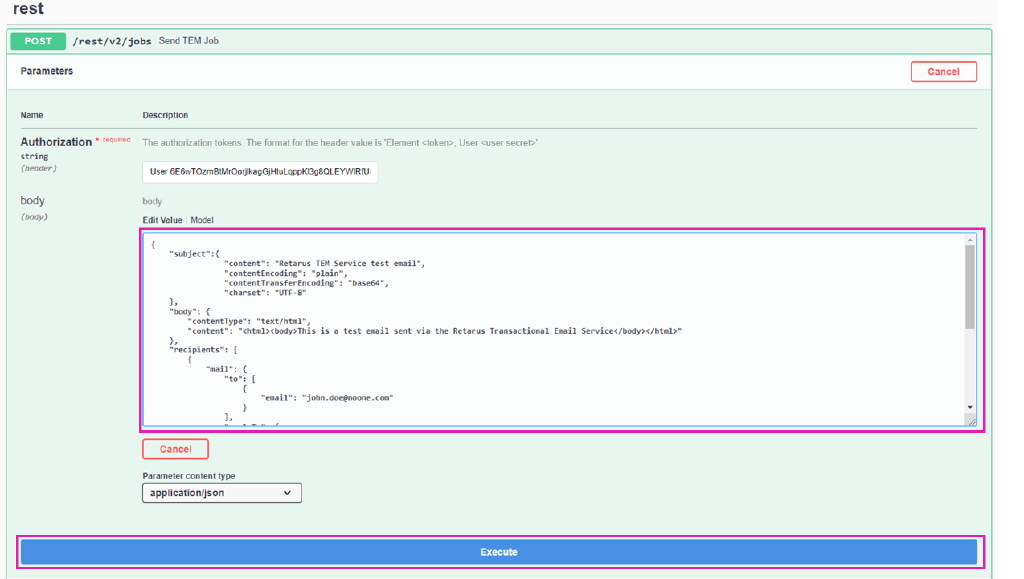 JSON{ "subject":{ "content":"Retarus TEM Service test email", "contentEncoding":"plain", "contentTransferEncoding":"base64", "charset":"UTF-8" }, "body":{ "contentType":"text/html", "content":"<html><body>This is a test email sent via the Retarus Transactional Email Service</body></html>" }, "recipients":[ { "mail":{ "to":[ { "email":"john.doe@noone.com" } ], "replyTo":{ "email":"jane.doe@retarus.com" }, "listUnsubscribe":"<mailto:jane.doe@retarus.com?subject=unsubscribe>, <https://example.com/unsubscribe.html>" } } ], "mail":{ "from":{ "email":"jane.doe@retarus.com" } }, "job":{ "referenceJob":"TestEmail", "costCenter":"MyCostCenter" } }
